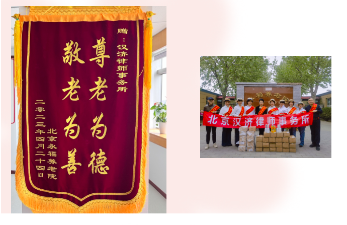 探望活动结束后,永福养老院领导与汉济律所赠送的礼品合影,同时送上锦旗,向汉济律所表达了发自肺腑的感谢。